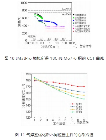 使用 JMatPro 軟件對 18CrNiMo7-6 鋼模擬 CCT 曲線,其結果如圖 10 所示。根據圖 10,如果在氣淬過程中避免珠光體轉變且硬度達到 380 HV10 以上,則需要滿足冷速在 60 ℃ /min 以上。在使用 fluent 對氣淬過程模擬時,間隔 1 s 輸出數據 DAT 文件,采用后處理軟件 CFD-Post 對模擬數據進行分析,對距離工件表面 20 mm 處( 約為齒輪心部硬度檢測位置) 溫度變化進行模擬檢測,并計算冷卻速度如圖 11 所示。根據圖 11 氣淬室改進后工件心部的冷卻圖,可以得出在難冷區的工件心部冷速均在 140 ℃ /min 以上,且易冷區的工件心部冷卻速度在 170 ℃ /min。可以推斷,增加導流裝置不僅可以提高難冷區的冷速,將難冷區的工件硬度提高至 380 HV10 左右,并且沒有由于減少易冷區的高壓氣體流量而導致易冷區的工件冷速不足。因此,此次仿真優化設計可以實施在相應結構上以解決實際問題。