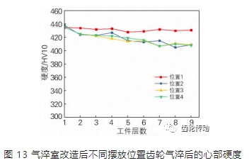 1) 當出風口流速小且工件層數過多時,部分置于氣淬室中心和底層工件受儲熱影響較大,其會因為冷速不足出現大部分心部硬度不足,心部組織不合格。