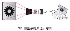 機器視覺齒輪精度參數檢測系統的原理如圖1所示,它通過成像系統將被測物面成像至光電檢測單元(相機感光面),光電檢測單元將光信號轉換為電信號(電子圖片),并將其傳送至上位機。上位機獲得檢測圖像后,利用圖像處理軟件從檢測圖像中提取出所需的幾何特征,在根據成像系統的數學模型,計算出所關心的幾何量,從而實現被測產品幾何參數的測量。