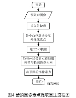 完成齒輪圖像的預處理后,基本上得到了齒輪的內外輪廓,如何從外輪廓像素中提取出有用特征,是最終實現齒輪幾何參數自動化測量的關鍵。本文以小模數圓柱直齒輪的齒距、齒厚和公法線長度3個重要的齒輪制造精度控制參數的自動測量為例,設計了機器視覺測量算法,具體流程圖如圖3所示。