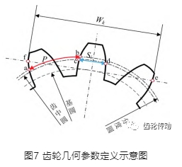 公法線長度是指齒輪上幾個輪齒的兩端異向齒廓間所包含的一段基圓圓弧的弦長,即該兩端異向齒廓間基圓切線線段的長度如圖7中Wk所示,也即測量點e和f之間的線段長度,以圖7所示跨齒數k=3為例,公法線長度的計算過程如下: