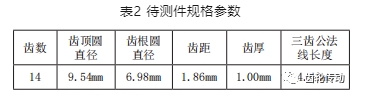 本文對精密傳動領域常用的14齒小模數直齒輪進行一系列齒輪參數測量實驗。為了驗證本文所述方法和系統的準確性,使用標準14齒小模數齒輪作為被測件,其主要幾何參數如表2所示。