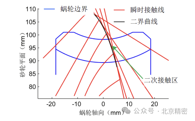 在20世紀90年代以前,評價平面二次包絡(luò)環(huán)面蝸桿傳動宏觀接觸狀態(tài)的瞬時接觸線、齒面接觸區(qū)域、各類界限曲線和評價微觀嚙合性能的誘導(dǎo)法曲率半徑系數(shù)、相對卷吸速度、潤滑角的計算都已經(jīng)非常成熟。以中心距為125mm,傳動比為40的未修形平面二次包絡(luò)環(huán)面蝸桿傳動為例,平面二次包絡(luò)蝸輪齒面上瞬時接觸線的分布如圖1所示。齒面存在接觸線交叉區(qū),該區(qū)域接觸頻率較高,容易發(fā)生疲勞點蝕,是蝸輪齒面最薄弱的地方。