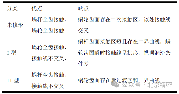 基于嚙合原理的修形的研究主要集中在修形類型的選取和修形量的選擇兩個方面。根據(jù)修形后平面二次包絡(luò)蝸輪齒面是否存在二界曲線,修形傳動可分為I型傳動和II型傳動。未修形、I型和II型平面二次包絡(luò)環(huán)面蝸桿傳動的性能對比如表2所示。