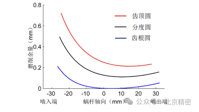 蝸桿毛坯裝夾在數(shù)控車床上,首先根據(jù)嚙合原理計算出蝸桿齒面上各點的坐標(biāo),然后通過三軸聯(lián)動,控制車刀頂刃的運動軌跡沿蝸桿齒面來進行車削。這種加工方式下車床數(shù)控系統(tǒng)必須具備三軸聯(lián)動功能,車削效率低,精度低。近幾年又出現(xiàn)了基于普通數(shù)控車床的新型車削技術(shù)。該技術(shù)采用普通切斷刀,利用宏程序和螺紋切削功能實現(xiàn)了變導(dǎo)程環(huán)面蝸桿的快速開齒。采用該技術(shù)可以顯著提高加工效率、降低制造成本,但是加工出來的是直廓環(huán)面蝸桿,需要進一步磨削才能成型。在其磨削過程中仍存在著加工余量不均勻的現(xiàn)象。如圖7所示,蝸桿嚙入端磨削余量大于嚙出端磨削余量,齒頂磨削余量大于齒根磨削余量。