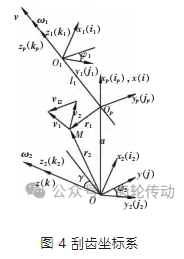 如圖 4 所示,根據刮齒坐標系可以對總變換矩陣 T 進行如下描述:
