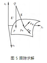 為提高計算效率,擬采用離散網格+跟蹤法對工件任一點與理論刮齒面之間的距離 lc 進行計算。根據求解出的初始點找出 lc。如圖 5 所示,假設任一點為 Q,對應理論刮齒面上的點為 p,點 p 在進行加工之前初始位置為 p0,Q 到 p 和 p0 的方向矢量定義為 U 和 S。由式(7)得到點 p0 在 S 和 U 兩個方向矢量上的偏導數 rLρ 和 rLξ。對矢量 S分別在U,rLρ 和 rLξ 三個方向上進行分解,可以描述為: