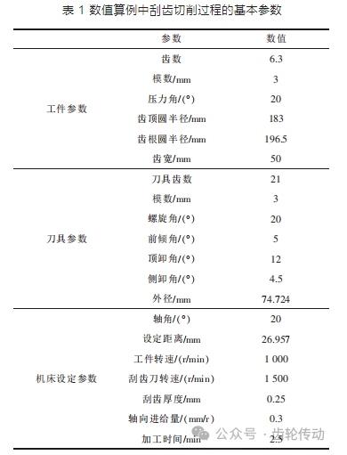 如文中描述,帶有增量的刮齒進給運動對工件邊緣的實際刮齒與理論刮齒之間存在誤差。引起齒側和齒根偏差的進給深度與不同的刀具參數、加工參數有關,例如齒輪和刀具的齒比及軸向進給速度,如表 1 所示。利用提出的數學模型對加工精度進行精確評估和計算。