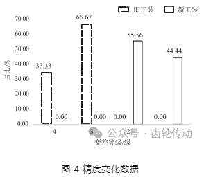 圖 4 為新舊工裝精度等級(jí)變化分布。多輪試驗(yàn)數(shù)據(jù)抽取顯示,采用矩陣式新工裝結(jié)構(gòu),齒輪精度最大變差從 4 級(jí)降低至 2 級(jí),有效減少 2 級(jí)。且精度變化 2 級(jí)從舊工裝 0%增加至新工裝100%, 占比有效提升 100%。