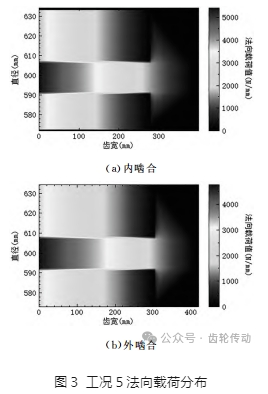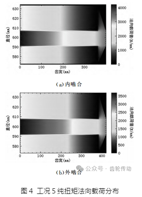 施加工況5六自由度載荷后,得到齒面法向載荷分布,如圖3所示。齒面接觸法向載荷沿齒寬方向由上風(fēng)向齒端往下風(fēng)向齒端逐漸降低,出現(xiàn)了載荷分布不均現(xiàn)象。內(nèi)嚙合最大單位長度法向載荷為5417N/mm,外嚙合最大單位長度法向載荷為4766N/mm。