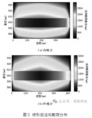 施加工況5的六自由度載荷,進(jìn)行第一級行星輪系齒輪修形前后對比計算分析,從最大單位長度法向載荷、傳動誤差、法向載荷分布方面進(jìn)行了評估。