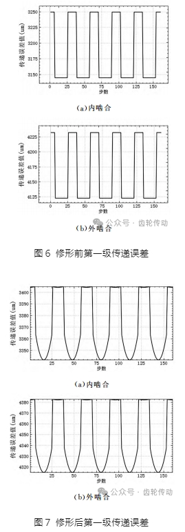 修形前第一級行星輪系傳遞誤差,如圖6所示,內(nèi)嚙合最大傳遞誤差為 105μm,外嚙合最大傳遞誤差為 109μm。修形后傳遞誤差,如圖7所示,內(nèi)嚙合最大傳遞誤差為63μm,外嚙合最大傳遞誤差為68μm。內(nèi)嚙合傳遞誤差降低了42μm,外嚙合降低了41μm。通對比修形前后的傳遞誤差可以得知,修形可以大幅降低行星輪系的傳遞誤差,對齒輪箱的動態(tài)性能有很大的改善。