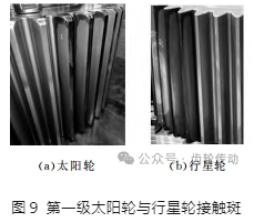 圖9為采用著色法,試驗后第一級行星輪系太陽輪和行星輪接觸斑,可以看出整個齒寬方向著色劑脫落,說明整個齒寬方向上接觸均勻,沒有出現(xiàn)偏載的現(xiàn)象。因此,通過試驗驗證了第一級行星輪系微觀修形方案是合理的。