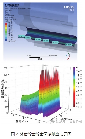 運用 ANSYS Workbench 18. 0 軟件對齒輪的接觸應(yīng)力進行分析,計算結(jié)果如圖 4 所示。在齒輪的嚙合位置處,齒面接觸應(yīng)力約為 55 MPa,且沿著齒寬方向應(yīng)力分布較均勻。