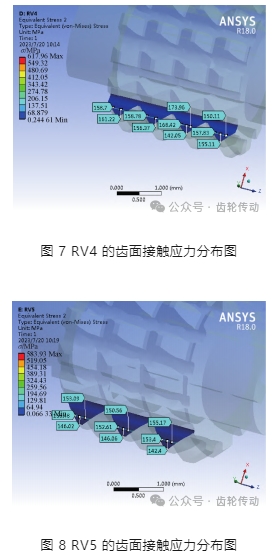 本文對不同螺距的端齒輪設(shè)置相同的邊界條件,均與直齒輪內(nèi)嚙合設(shè)置的邊界條件保持一致。經(jīng)過有限元數(shù)值仿真計算,得到了不同螺距下的齒面接觸應(yīng)力云圖,如圖 5~圖 8 所示。