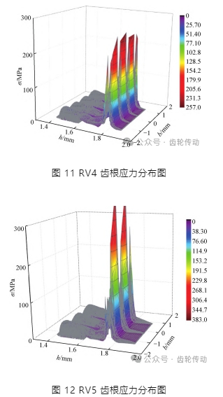 從圖 9 至圖 12 中可以看出,相較于連續(xù)齒面的外齒輪齒根應(yīng)力分布云圖(見圖 4) ,齒根部分 (齒高 1. 4 mm 至 1. 6 mm 之間) 應(yīng)力分布呈波浪狀,波峰數(shù)或波谷數(shù)與齒寬方向的小齒牙數(shù)相同, 且隨著螺距的增加,外齒輪齒根部分波動幅度就越大。這是由于螺紋將齒輪分割成多個獨立的小齒牙,齒輪在嚙合過程中,有小齒牙的齒輪根部應(yīng)力值較大,形成波峰;在螺紋槽對應(yīng)的齒輪根部由于沒有小齒牙參與嚙合,齒根部分應(yīng)力值較小,形成波谷。隨著螺紋螺距的增加,螺紋的小徑減小, 即螺紋底徑更接近外齒輪的根部,齒輪在嚙合過程中,有小齒牙的根部需要分擔的抗彎拉力就增大,導(dǎo)致應(yīng)力值增大,螺紋槽對應(yīng)的齒根部分需要分擔的抗彎拉力減小,應(yīng)力值相應(yīng)減小,最終導(dǎo)致齒根部分應(yīng)力分布波動幅值增大。這種波動幅值增大現(xiàn)象將不利于齒輪的承載,在設(shè)計行星滾柱絲杠螺距時,在螺距較大的情況下需要校核齒根抗彎強度,防止小齒牙齒根斷裂失效。