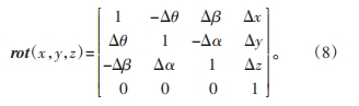 因為轉動角Δα、Δβ、Δθ都為極小值,所以各轉動角的cos()值為1,各轉動角的sin()值為其轉動角的弧度值,忽略變換矩陣中各項的高階無窮小,則矩陣可簡化為
