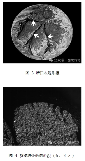 失效螺栓斷口宏觀形貌如圖 3 所示。圖中箭頭所示為裂紋快速擴展撕裂棱,并呈典型的棘輪狀特征分布。根據撕裂紋路收斂方向判斷裂源位于斷口邊緣表面區域,裂源處未見與斷裂有關的宏觀冶金缺陷和機械損傷痕跡,瞬斷區位于斷口中部。在宏觀體式顯微鏡下觀察,斷面粗糙,呈結晶顆粒狀,斷面干凈,無腐蝕產物,無明顯宏觀塑性變形,斷面呈典型的脆性斷裂特征,如圖 4 所示。