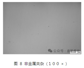 將斷裂螺栓縱向剖開取樣,在拋光態下按 GB/T 10561—2005《鋼中非金屬夾雜物含量的測定標準評級圖顯微檢驗法》進行檢驗,結果為:A0.5,B0,C0.5,D0.5,如圖 8 所示,說明非金屬夾雜物輕微,未見異常。