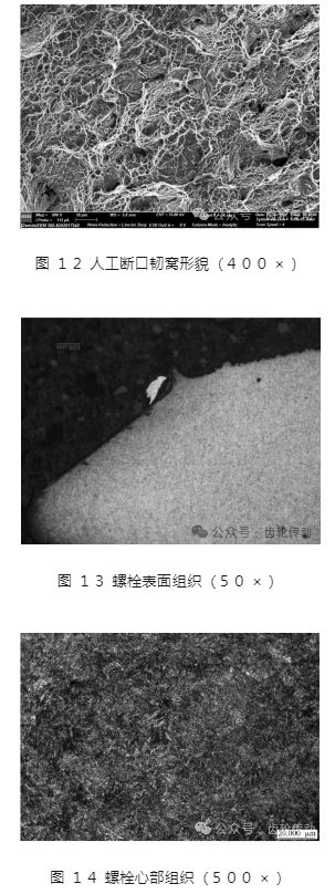 對螺栓淬火后,調整了原來的回火工藝參數,將回火溫度提高到(520±20)℃ ,保溫時間延長至 120 min,淬火爐內保護氣氛控制在 0.30% ~ 0.40% 。將工藝調整后的螺栓人工折斷后進行掃描電鏡分析,斷口呈正常韌窩形貌,如圖 12 所示,硬度測試結果為 386 ~ 388 HV,符合 GB / T 3098.1—2010《緊固件機械性能螺栓、螺釘和螺柱》中對 12.9 級螺栓硬度規定的 385 ~ 435 HV。顯微組織為均勻細回火索氏體,表面無增碳現象,如圖 13 和圖 14 所示。工藝改進后的螺栓未發現延遲開裂現象。