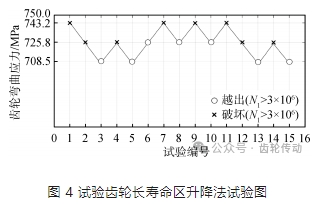 齒輪彎曲壽命的無限壽命區,采用升降法測試疲勞極限應力。試驗時指定“循環基數 N0”(根據 GB3480 規定,本文采用 N0=3×106 次作為循環基數)下測定“疲勞極限”,若輪齒發生破壞并逐漸降低應力水平。試件在第 i 級最大應力 Si 作用下未達到循環基數 N0發生破壞,而在較低的第 i+1 級最大應力 Si+1作用下“越出”(達到循環基數未破壞),對應循環基數 N0的疲勞極限必發生在 Si和 Si+1之間。本試驗固定應力水平升降區間(即增量或減量)為 20~25 MPa。