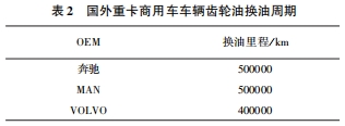 除卻北美地區外,國外其他地區的車輛齒輪油換油里程已從 10 × 10 4 km 普遍發展到 50 × 10 4 km 的水平,如圖 1 所示。國外重卡領先企業的車輛齒輪油換油周期如表 2 所示。