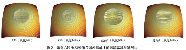 此外,在產品開發過程中,試驗也與國外同類長 壽命車輛齒輪油各項性能進行了對比。以 50 × 10 4 km 不換油的變速箱油 T50 和驅動橋油 A50 的抗磨性能考察來說,分別對油品進行老化試驗,不同的時間后,通過觀察其磨斑三維形貌圖的方式,開展了昆侖 50 × 10 4 km 不換油的驅動橋油 A50、變速箱油 T50 與國外競品的對比工作,結果如圖 3、圖 4 所示。