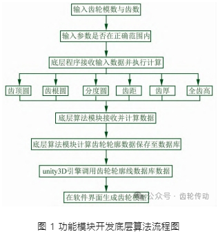 基于 Python、C#等計算機語言編程技術,通過調用編譯的齒輪參數運算底層算法模塊代碼庫及數據庫,以 unity3D 引擎二次開發為手段,實現自動運算并實時生成對應齒輪系統 3D 數字模型的交互式、可視化實時場景呈現功能,并通過仿真運行對齒輪傳動設計的正確性進行功能驗證。以齒輪分析與設計模塊為例,設計并制定該功能模塊的算法開發流程,如圖 1 所示。輸入齒輪模數與齒數后,系統會自動調用底層算法進行比較分析,將符合條件的參數設計值的計算結果返回系統界面,自動繪制相應參數下的齒輪輪廓線并生成三維模型,實現從數學模型到三維可視化模型的轉化。