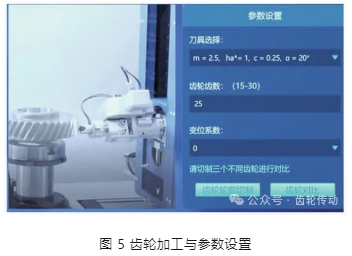 該模塊可將(1) 中設計的齒輪,通過加工刀具參數的設定、目標齒數設定及齒輪變位系數的設定,即可實現對設計齒輪的制造,呈現齒輪的加工過程與制造方法。如圖 5 所示,選擇刀具參數: m = 2.5,齒數 z = 25,變位系數 = 0,ha* = 1,c = 0.25,α = 20°,點擊“齒輪輪廓切制”,即可實現對設計齒輪的切制加工,并呈現齒輪加工過程。通過改變齒輪加工的參數設置,可對不同參數下的加工齒輪進行對比分析與研究,從而選擇最優齒輪加工參數,實現了三維空間下對設計的齒輪進行虛擬加工制造過程仿真。