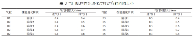 對發動機健康狀態評估的驗證,筆者在保證進氣門不變的情況下,調大了排氣門間隙,并選擇 B2 和 B5 氣缸進行退化特征對比分析。從圖 1 中可以看出,隨著氣門機構從一個階段退化到下一個階段,退化特征值呈現出明顯的差異,表現為遞增趨勢。這一結果有效地驗證了退化特征的有效性,見表 3。