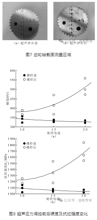 齒輪軸發(fā)生扭轉(zhuǎn)疲勞破壞的臨界條件是:外部載荷P≥扭轉(zhuǎn)疲勞極限 Pmax,且達到該外部載荷對應服役疲勞壽命(服役時間)。超聲沖擊應力調(diào)控的兩項作用分別是表面強化和預制壓應力場。表面強化對材料自身強度提升在50~800MPa不等,預制壓應力場對材料承載能力的容限增加在 120~ 300MPa不等。這兩項作用可以從提升材料變形抗力和抑制疲勞裂紋萌生,都可以提升扭轉(zhuǎn)疲勞極限 Pmax,從兩個角度實現(xiàn)齒輪軸延壽。但還得考慮不同沖擊能量對齒輪軸表面粗糙度的影響,粗糙度的增加會增加應力集中系數(shù),對外部載荷 P 有放大作用,不利于延壽,應盡量減少粗糙度的增加。從上面分析結(jié)果,建議選用參數(shù)1.5A 沖擊電流實施實物超聲沖擊應力調(diào)控,并在現(xiàn)場裝配驗證延壽效果。