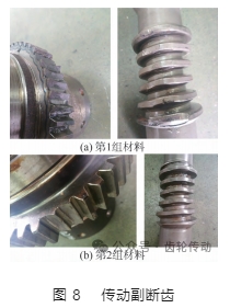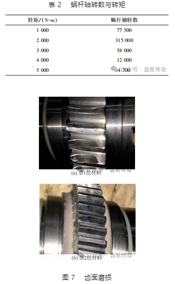 兩組不同材料的傳動副負荷加載量級和加載方法完全相同,轉矩從 1 000 N·m 開始加載,步長為 1 000, 加載到 5 000 N·m,蝸桿軸轉數與轉矩加載的對應關系如表 2 所示。按照 25 年設計壽命的負荷運載,兩組材料齒面的磨損情況如圖 7 所示,兩組傳動副斷齒出現的負荷量級相同,均為 28 000 N·m,其折斷情況如圖 8 所示。由圖 7 和圖 8 可知:第 1 組材料傳動副漸開線齒輪輪齒斷齒數量較多,齒輪齒面磨損更為嚴重;第 2 組材料傳動副漸開線齒輪有 2 顆齒斷齒,相對第 1 組材料而言,蝸桿和齒輪齒面磨損較輕,兩組材料斷齒均從齒根折斷;從磨損情況、折斷數目與折斷位置來看, 與前述有限元應力應變分析結果吻合。