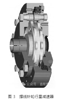 擺線針輪行星減速器是以應用行星式傳動為基礎、以擺線針齒嚙合為載體的傳動裝置,如圖 3 所示。與其他減速器結構類似,構成擺線針輪行星減速器主要分為輸入部分、減速部分和輸出部分。不同于其他減速器,擺線針輪行星減速器在輸入端設有一個雙偏心套,并在偏心套上配有兩個滾珠軸承,構成了該減速器的 H 機構,并以此為基礎組成了擺線針輪行星減速器種齒差為 1 的內(nèi)嚙合減速結構。擺線針輪行星減速器承載能力大,因此被廣泛應用于如礦山、化工和起重等工程機械領域。