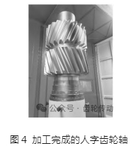 人字齒輪在重型機械中具有承載能力高、傳動平穩和軸向載荷小等優點,在重型機械的傳動系統中有廣泛的應用。人字齒輪軸的制造流程相對普通齒輪的更為復雜、難度更高,并且對于大模數窄退刀槽的人字齒輪軸零件,無法使用齒輪加工專用設備,因此,加工工藝設計為工件的外形輪廓由數控車床車削完成,齒形的加工采用通用銑床完成。