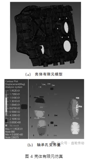 根據失效原因分析,計算殼體變形引起的偏載。建立殼體有限元模型,在一檔最大輸入扭矩的工況下,對支撐傳動系統的軸承座孔進行受力分析,對殼體進行受力加載,分析軸承孔剛度,計算殼體變形量如圖 4 所示。根據殼體變形量,對齒輪軸線平行度進行計算,將水平方向上的變形等效替換到螺旋角方向上,進行補償修形,從而減少偏載現象。