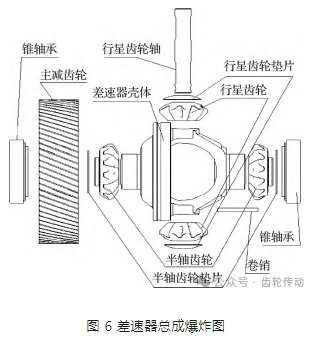 差速器總成結(jié)構(gòu)爆炸圖如圖 6,其零部件有差速器殼體空腔內(nèi)分布左右半軸齒輪墊片及半軸齒輪,上下分布行星齒輪墊片及行星齒輪,裝配時,把左右半軸齒輪墊片及半軸齒輪、上下分布行星齒輪墊片及行星齒輪,放在差速器殼體內(nèi),行星齒輪軸穿過差速器差殼、行星齒輪及行星齒輪墊片的內(nèi)孔,再通過卷銷固定到差速器殼體上,把主減齒輪壓裝到差速器殼體上并焊接,再對主減齒輪進(jìn)行磨齒,通過兩端軸承分別位于差速器殼體左右兩端軸頸,裝配到殼體軸承孔內(nèi),起到支撐作用 .