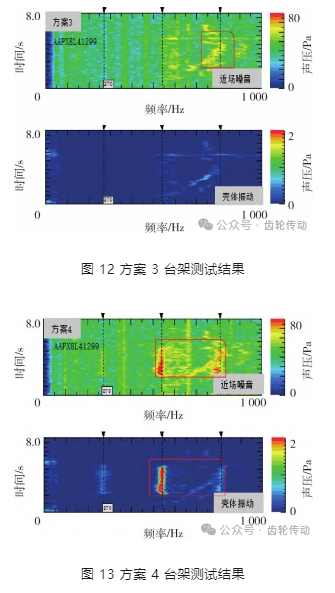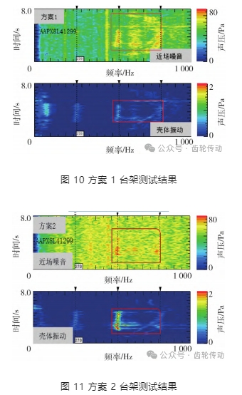針對以上優(yōu)化改善對策進(jìn)行組合裝配樣機,對不同方案總成分別進(jìn)行臺架測試,測試驗證分析結(jié)果如圖 10 ~ 13.