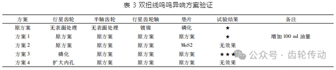 通過對整車、電驅(qū)動總成臺架測試以及差速器內(nèi)部零件結(jié)構(gòu)及工作原理分析,整車在雙扭線工況行駛時,行星齒輪與行星齒輪軸之間配合間隙較小,在差速器實現(xiàn)差速時,它們受載出現(xiàn)軸向和自轉(zhuǎn)運動,導(dǎo)致行星齒輪軸與行星齒輪內(nèi)孔發(fā)生不連續(xù)的金屬摩擦聲; 另外行星齒輪內(nèi)孔表面未采用涂層處理和行星齒輪軸表面采用鍍鎳處理,零件表面油膜吸附能力較低,形成地動態(tài)油膜較少,同時在 整車差速時,它們之間潤滑油膜穩(wěn)定性的動態(tài)壓力遭到破壞,造成它們發(fā)生干摩擦,最終造成金屬摩擦聲,故通過上面異響產(chǎn)生的機理分析,制定以下驗證優(yōu)化方案.