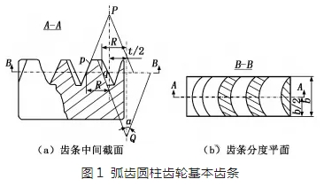 通常情況下,研究弧齒圓柱齒輪時以弧齒圓柱齒輪的基本齒條為基礎來進行。圖1為弧齒圓柱齒輪基本齒條,p、q分別為輪齒的凸、凹面,它們是兩個圓錐體P和Q 的一部分,R為分度圓處圓錐錐體半徑,t/2為兩圓錐軸線間距,b為齒條寬度,A-A截面為齒條的中間截面,B-B截面為齒條分度平面,截面A-A處齒條具有漸開線齒形。研究發現,弧齒圓柱齒輪在輪齒中間截面的齒形與漸開線直齒圓柱齒輪相同,所以弧齒圓柱齒輪的設計計算可參照漸開線直齒圓柱齒輪進行,其基本幾何參數為模數m、齒數z、壓力角α、齒頂高系數ha* 和頂隙系數c*,幾何尺寸計算與漸開線直齒圓柱齒輪相同,計算公式如表1所示。