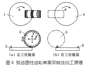 利用單面刃刀具分別精切弧齒圓柱齒輪凸、凹面的優點是可將內、外單面刃刀具設計為半徑相等的刀具,切制出的輪齒凸、凹面精度較高。但是,由于凸、凹面需要分別切制,因此必須考慮加工過程中齒坯安裝與刀具更換問題,一旦在加工過程中需要更換刀具或拆、裝齒坯,必然會影響輪齒的加工精度。為此,提出弧齒圓柱齒輪的單面雙銑加工方法,其加工原理如圖4所示,弧齒圓柱齒輪輪齒切制過程中,在專用銑齒機床上設計兩個工位分別切制輪齒的凸、凹面。在圖4 中,1、4分別表示位于左、右兩個工位的凸、凹面單刃銑齒刀具,2、5分別表示銑削凸、凹齒面時的被加工弧齒圓柱齒輪齒坯,3、6分別為凸、凹面單刃銑齒刀具。由此可見,弧齒圓柱齒輪的切齒加工需要專用的數控銑齒設備來完成。