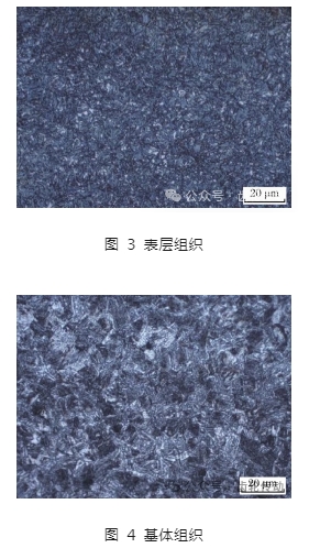 斷裂的齒輪根部表面存在網狀非馬氏體組織,測試其深度約為 0.04 mm(圖 5)。滲碳(碳氮共滲)在淬火后零件表面理想的組織應該為細針狀高碳馬氏體,但因為熱處理工藝及加工工藝等工序諸多不可控的因素,在齒輪表面形成了貝氏體、屈氏體(珠光體類)等一些非馬氏體的混合組織,造成了嚴重的質量缺陷。非馬氏體組織深度如果超標嚴重,在力學性能上就會出現零件表面硬度低的現象,影響硬度梯度,出現測試硬度不均勻的結果。