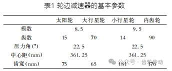 應(yīng)用 RomaxDesigner軟件進(jìn)行建模,分別建立齒輪組、軸的幾何模型,齒輪選用的材料是 20Cr2Ni4A 合金鋼,20Cr2Ni4A 合金鋼的材料參數(shù)分別是彈性模量 207GPa、泊松比0.29、密度7.85t/m3,輪邊減速器的基本參數(shù)見表1。