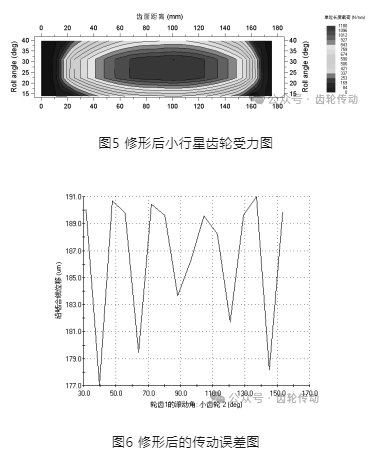 從齒面載荷分布情況看修形前小行星輪與內(nèi)齒輪之間存在明顯的偏載現(xiàn)象,齒輪的一端基本沒有承受載荷, 而另一端承受的載荷非常大。導(dǎo)致齒輪一端出現(xiàn)膠合等失效形式,影響輪邊減速器的工作性能。從圖4中能夠得出,修形前的齒輪副傳動(dòng)誤差較大,會(huì)產(chǎn)生嚴(yán)重的嚙合沖擊。所以必須對(duì)小行星輪與內(nèi)齒輪進(jìn)行齒輪修形,考慮到 修形成本和難度故只對(duì)小行星輪進(jìn)行修形,不對(duì)內(nèi)齒輪修形。