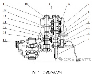 變速箱結構如圖 1 所示,包括輸入軸、輸入軸一檔齒輪、惰輪、輸入軸倒擋齒輪、輸入軸二檔齒輪、輸入軸三檔齒輪、輸入軸四檔齒輪、輸入軸五檔齒輪、輸入軸六檔齒輪、輸出軸、輸出軸六檔齒輪、輸出軸五檔齒輪、輸出軸四檔齒輪、輸出軸三檔齒輪、輸出軸二檔齒輪、惰輪從動輪、輸出軸一檔齒輪,對應圖 1 的 1~17 編號所對應的零部件。