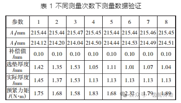 選取一組數據作為代表,通過裝配過程中的標定數值變化計算補償值,記錄實際使用墊片的厚度以及預緊力矩的大小,與測量機測量的數據結果以及運算結果對比進行驗證,以此來判斷測量機構的性能,如表 1 所示。
