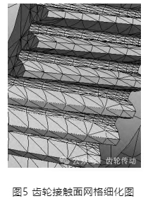 有限元法采用的四面體單元進行網格劃分和計算, 對齒輪傳動系的網格劃分采用的網格大小為5mm,如圖4 所示。在完成了整個網格劃分之后,將各嚙合面的網格按層次細化, 如圖 5 所示。網格劃分完后網格數量為 121131個,節點數量為216074個。