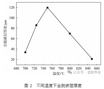 相比半脫碳層,全脫碳層厚度對材料性能有更加嚴(yán)重的負面影響,它會大大降低材料的力學(xué)性能,如降低強度、硬度、耐磨性以及疲勞極限等,還會增加裂紋敏感度、影響焊接質(zhì)量等。因此,控制全脫碳厚度對提升產(chǎn)品性能意義重大。圖 2 為全脫碳層厚度隨溫度的變化曲線,更加清晰地展示了全脫碳厚度的變化,從圖中可以看出,在 700 ℃時全脫碳層厚度只有 34 μm 左右; 隨著溫度升高到725 ℃,全脫碳層厚度明顯增加,為 86 μm,比 700 ℃時全脫 碳層厚度的 2 倍還多; 當(dāng)溫度升高到 750 ℃時,全脫碳層厚度達到最大值 120 μm; 隨著溫度繼續(xù)升高,全脫碳層厚度開始大幅下降,800 ℃ 時降到 70 μm,到 850 ℃時降到最小值 20 μm 左右。