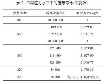 第一組試樣的疲勞壽命如表 2 所示。從表 2 可以看出,在不脫碳的情況下,試驗鋼僅在 810 MPa 應(yīng)力水平下循環(huán)次數(shù)為 107 次,試樣未發(fā)生斷裂; 當(dāng)應(yīng)力水平超過 830 MPa 以上時,部分試樣開始出現(xiàn)斷裂; 當(dāng)應(yīng)力水平在 850 MPa 以上時,疲勞試樣全部斷裂。