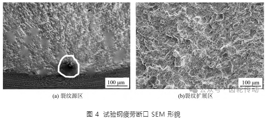 采用掃描電鏡對試樣疲勞斷口形貌進行觀察,如圖 4 所示。圖 4(a) 為試樣裂紋源區(qū),圖中可以看出明顯的疲勞弧線,根據(jù)疲勞弧線找到疲勞源,可見,裂紋源為“魚眼狀”的非金屬夾雜物,夾雜物處易造成應(yīng)力集中,產(chǎn)生疲勞裂紋; 圖 4(b) 為裂紋擴展區(qū)形貌,可見明顯的疲勞條紋,呈河流狀分布,屬于準(zhǔn)解理斷裂,隨著裂紋不斷擴展,最終導(dǎo)致斷裂。
