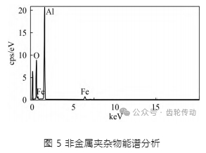 為判定圖 4(a) 中夾雜物的類型,特對其進行能譜成分分析,結(jié)果如圖 5 所示。可以看出,非金屬夾雜物主要為 Al2O3夾雜物,說明該夾雜物是引起夾雜物起裂的主要裂紋源。